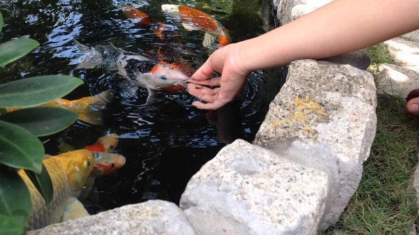 Một kinh nghiệm quý báu nữa mà người nuôi koi lâu năm chia sẻ chính là cách cho cá ăn hàng ngày. Cá koi không chỉ ăn tạp mà còn phàm ăn, chúng luôn cần dinh dưỡng để có thể phát triển. Bổ sung đầy đủ chất đạm, vitamin và khoáng từ các loại thức ăn tự làm hay thức ăn dạng viên là cách nuôi cá koi Nhật giúp cá mau lớn, khỏe mạnh và lên màu đẹp. Một điều cần phải lưu ý khi nuôi cá koi Nhật là tuyệt đối không cho cá ăn các loại động vật sống như tôm, tép, giun… để tránh nhiễm sán và vi khuẩn. Về số lần cho ăn trong ngày, nên cân đối chia nhỏ lượng thức ăn thành nhiều bữa để đàn cá ăn hết trong một lần, tránh dư thừa thức ăn lắng xuống đáy hồ/bể nuôi làm ô nhiễm nước. Mỗi bữa ăn của đàn cá cách nhau khoảng thời gian từ 4 – 5 tiếng là tốt nhất.